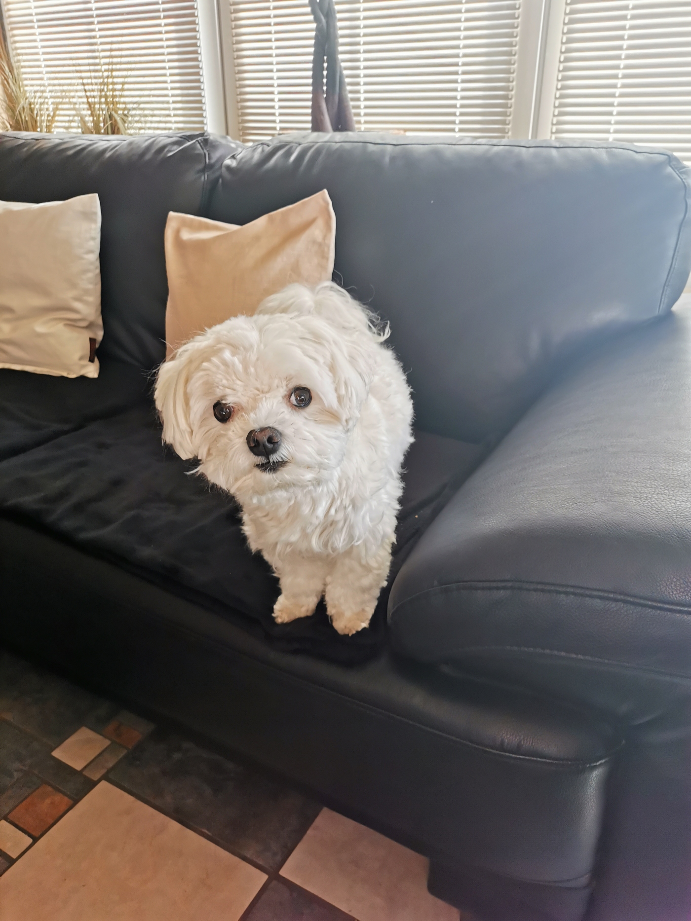 Weisser Malteser, schwarze Augen und Nase, sehr zutraulich