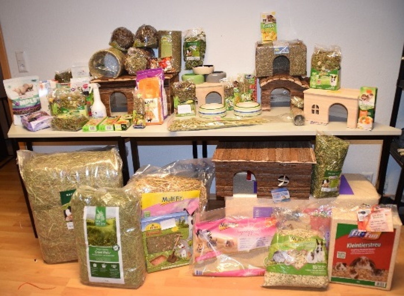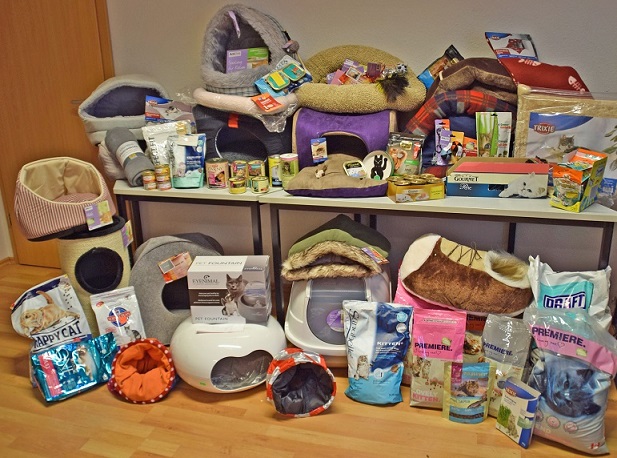 Eine Auswahl der Katzengeschenke, wie Nass- und Trockenfutter, hochwertige Leckereien, Spielzeug, Fummelbretter, Höhlen, Tunnel, Körbchen, Decken, Kissen, Trinkbrunnen und vieles mehr.
