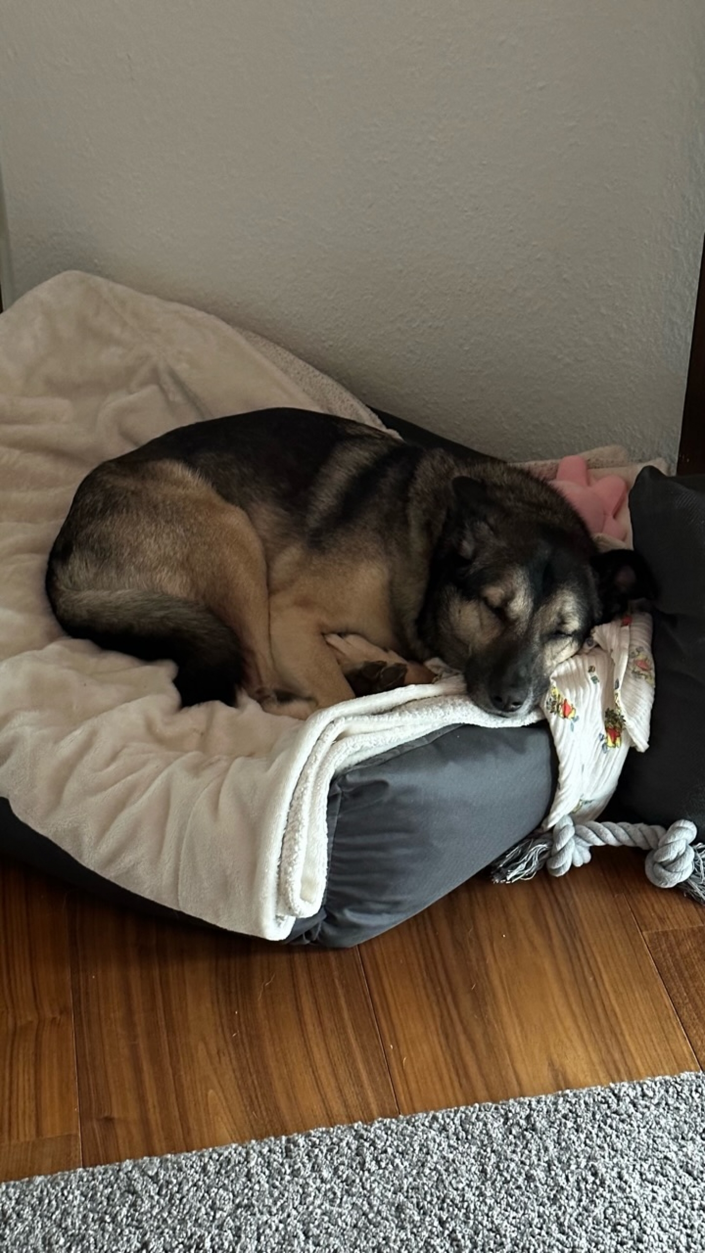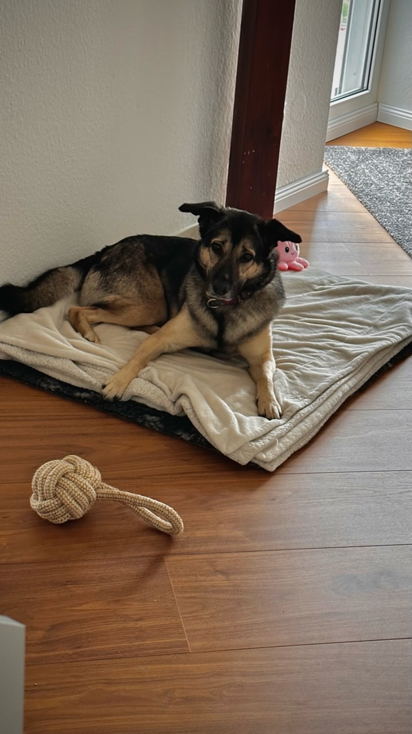 Guten Tag und ein frohes Wuff Wuff von der kleinen Laika. Nach nun mehr einer Woche im neuen Zuhause hier ein kleiner Bericht wie es der Laika ergangen ist. Seit Tag 1 fühlt sie sich hier pudelwohl! Sie hat sich schnell an die neue Umgebung sowie die neuen Leute gewöhnen können, trotz anfänglichen Hemmungen der Menschen gegenüber hat sie hier alle in Herz schließen können so wie sie von allen in Herz geschlossen wurde. Es gibt immer wieder Momente wo sie versucht ihren Willen über den der anderen zu setzen, merkt aber schnell das sie damit nicht weit kommt. Zwischen Laika und ihrem Hausgenossen Hank ist eine echte kleine Liebe entstanden(Fotos sind beigefügt). Den Garten hat sie ebenfalls(trotz Leinenzwang) für sich entdecken können (Video kann hier leider nicht angehangen werden). Ansonsten genießt sie den Ausblick übers Feld und folgt allem was dort passiert. Von ihrer Art und dem Charakter kann ich inzwischen der Aussage von Ramon das dieser eher mit einer K atze zu vergleichen ist vollkommen zustimmen ???????????? Dennoch ist sie sehr wissbegierig und es macht Spaß mit ihr zu arbeiten! Wir danken nochmal für das angenehme Zusammenarbeiten und die netten Gespräche beim vermitteln. Wir hoffen ihr hattet ein schönes Osterfest ???? Lg von Kevin, Sina und Laika