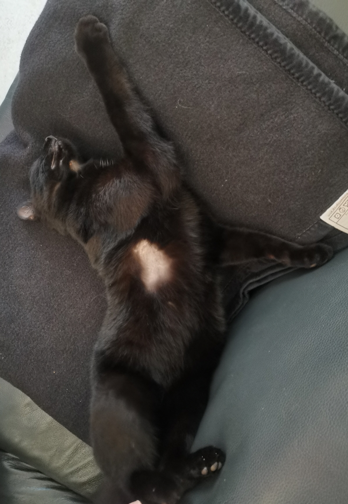 schwarz mit weißen Malen, sehr zutraulich, etwas tollpatschig, mag Wasser, z.Z. am Brustkorb 3x7 cm sehr kurze Haare
