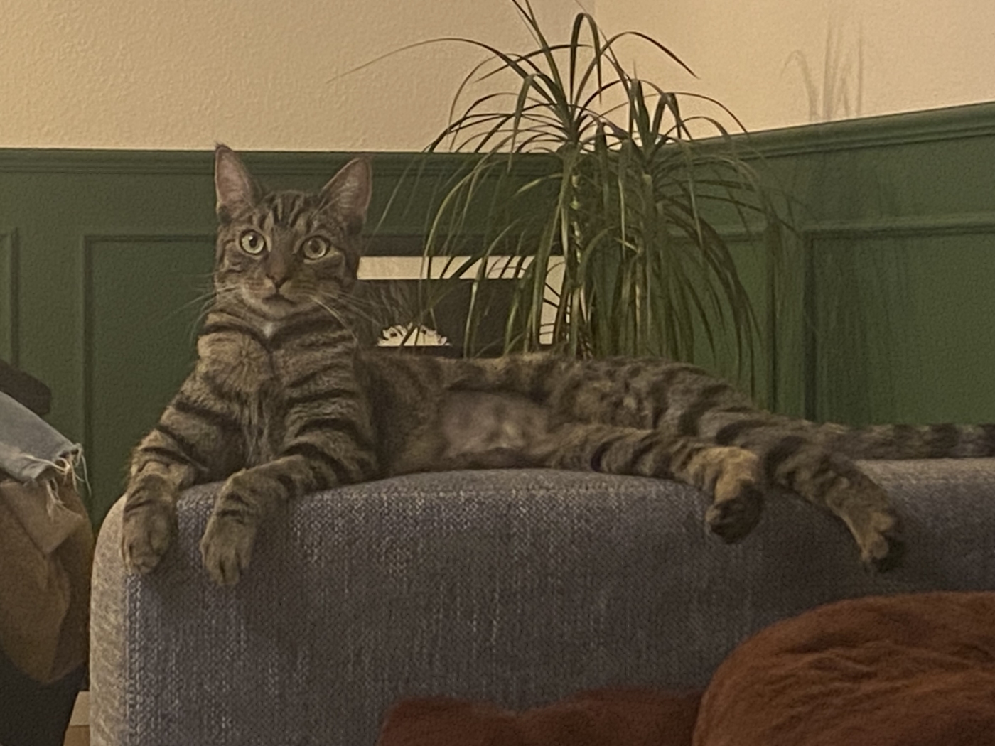 Er ist schwarz/braun/grau getigert und sehr zierlich