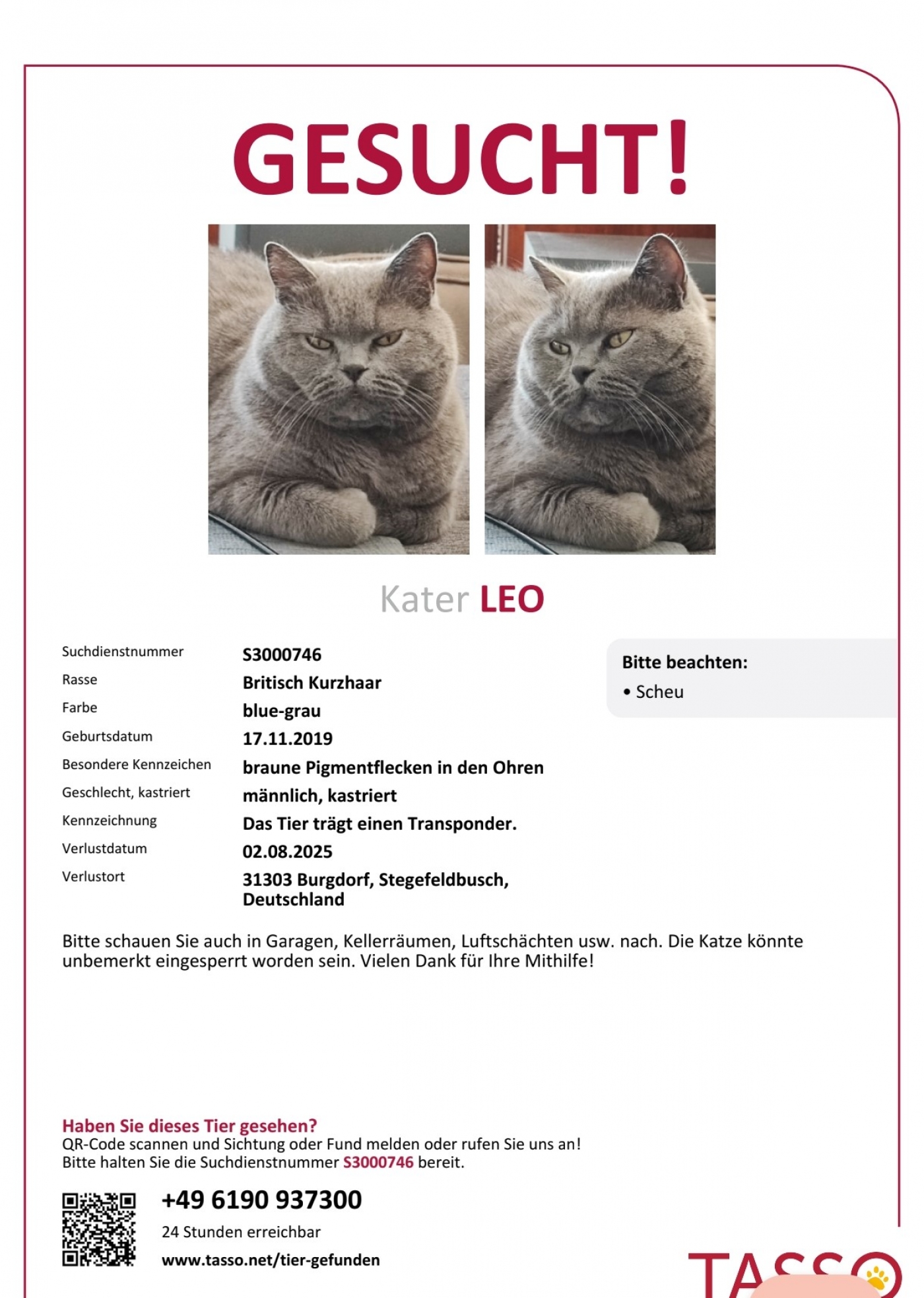 Bei Informationen über dessen Verbleib, bitte im Tierheim unter der 05136 3545 oder direkt beim Besitzer Carmen unter der Rufnummer 01732111320 melden.