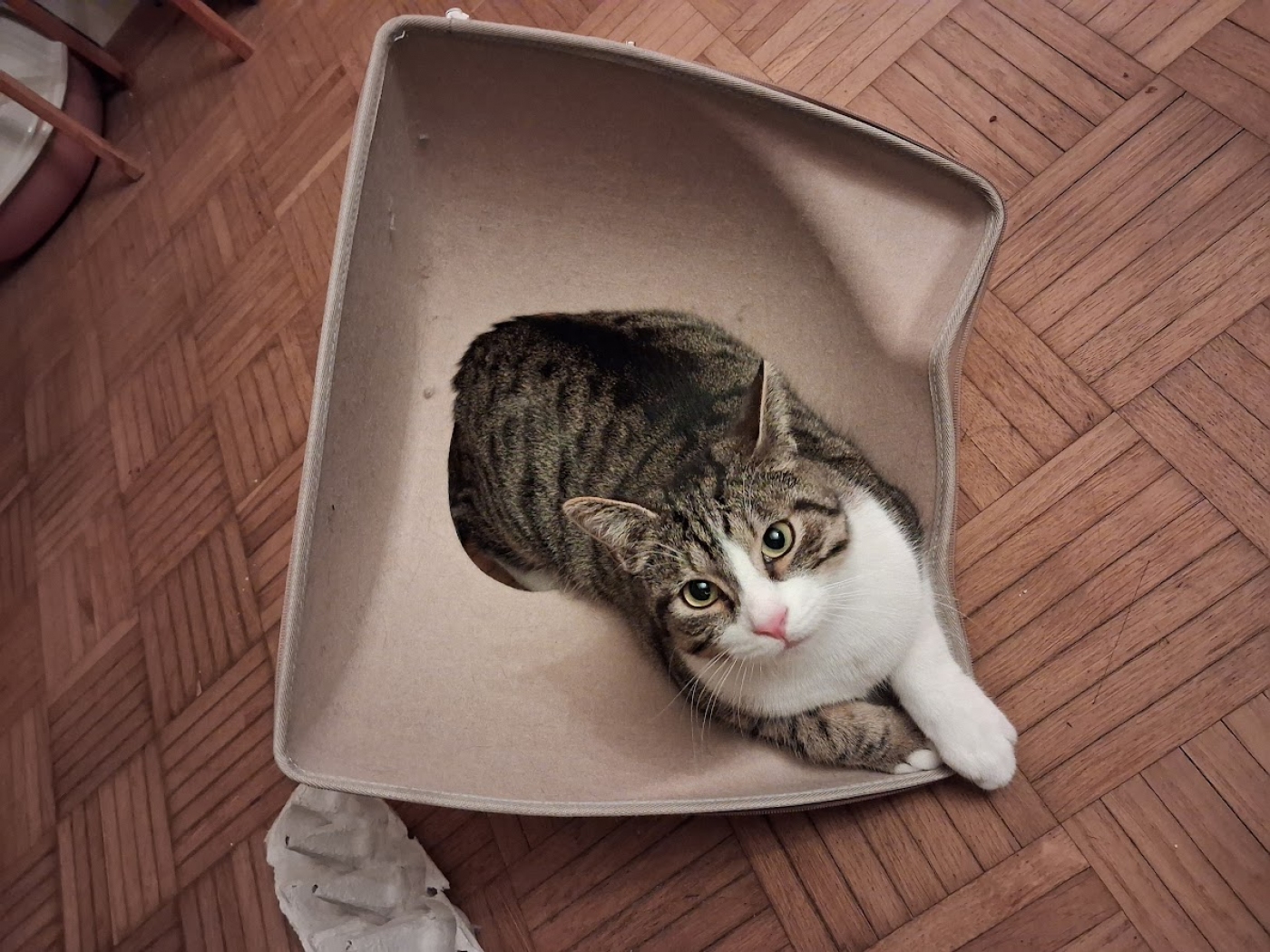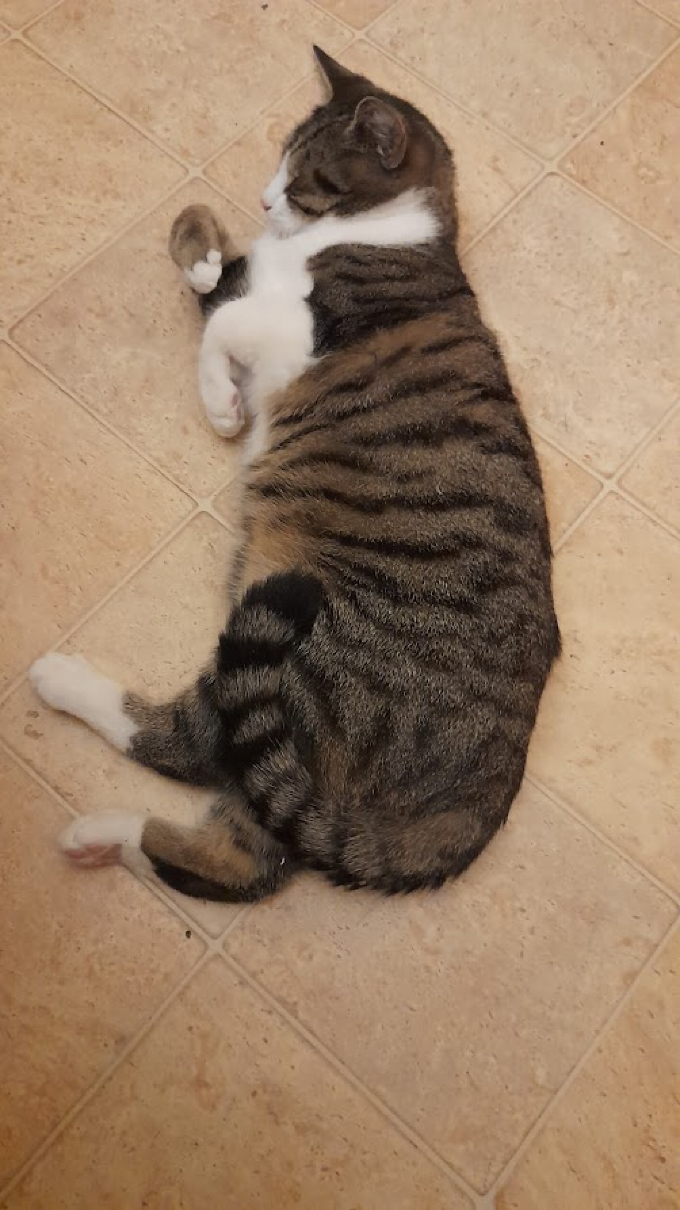 Er ist grau getigert, hat einen weißen Latz und sein linkes Vorderbein ist auch weiß. Seine Pfotenspitzen sind weiß und er hat einen weißen Fleck am linken Oberschenkel. Da er kein Freigänger ist, kennt er sich draußen nicht aus. Er ist scheu, hört aber auf seinen Namen.