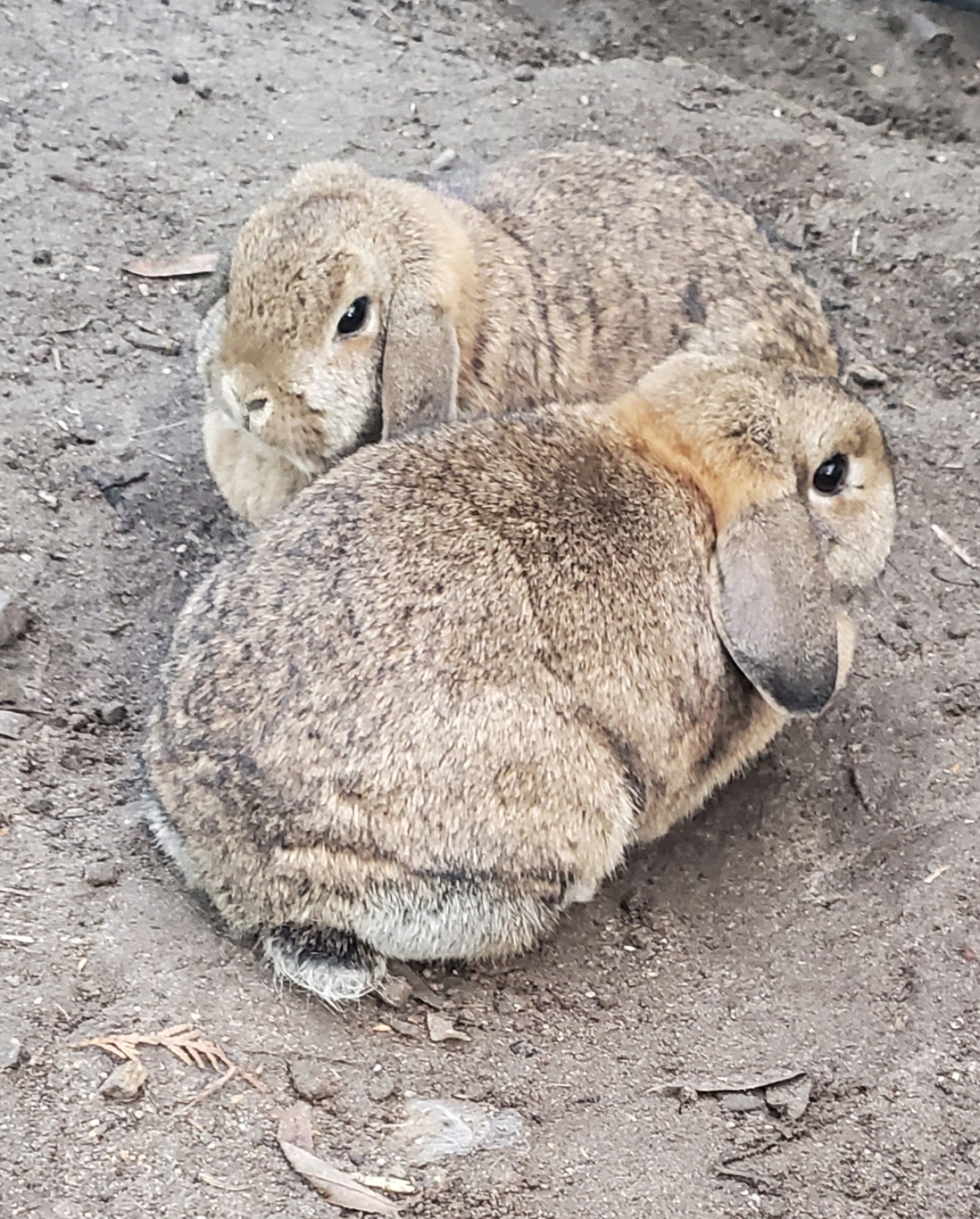 Die beiden zwei Jahre alten und gesunden Hasen (Mily und Lily) werden derzeit gemeinsam draußen gehalten.