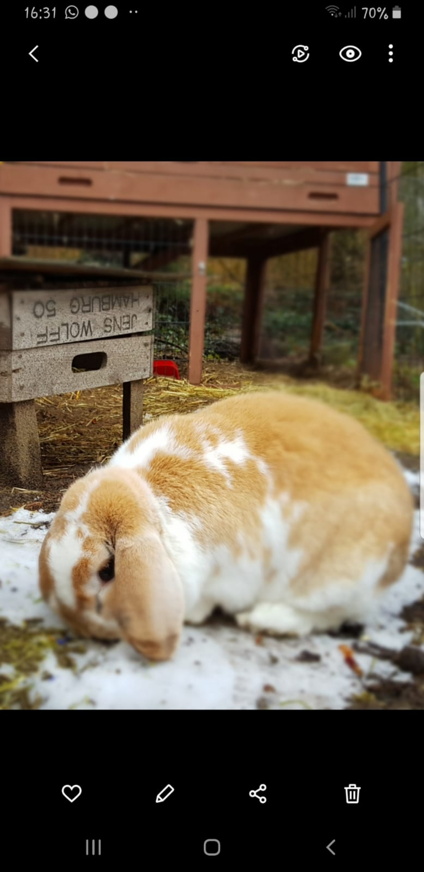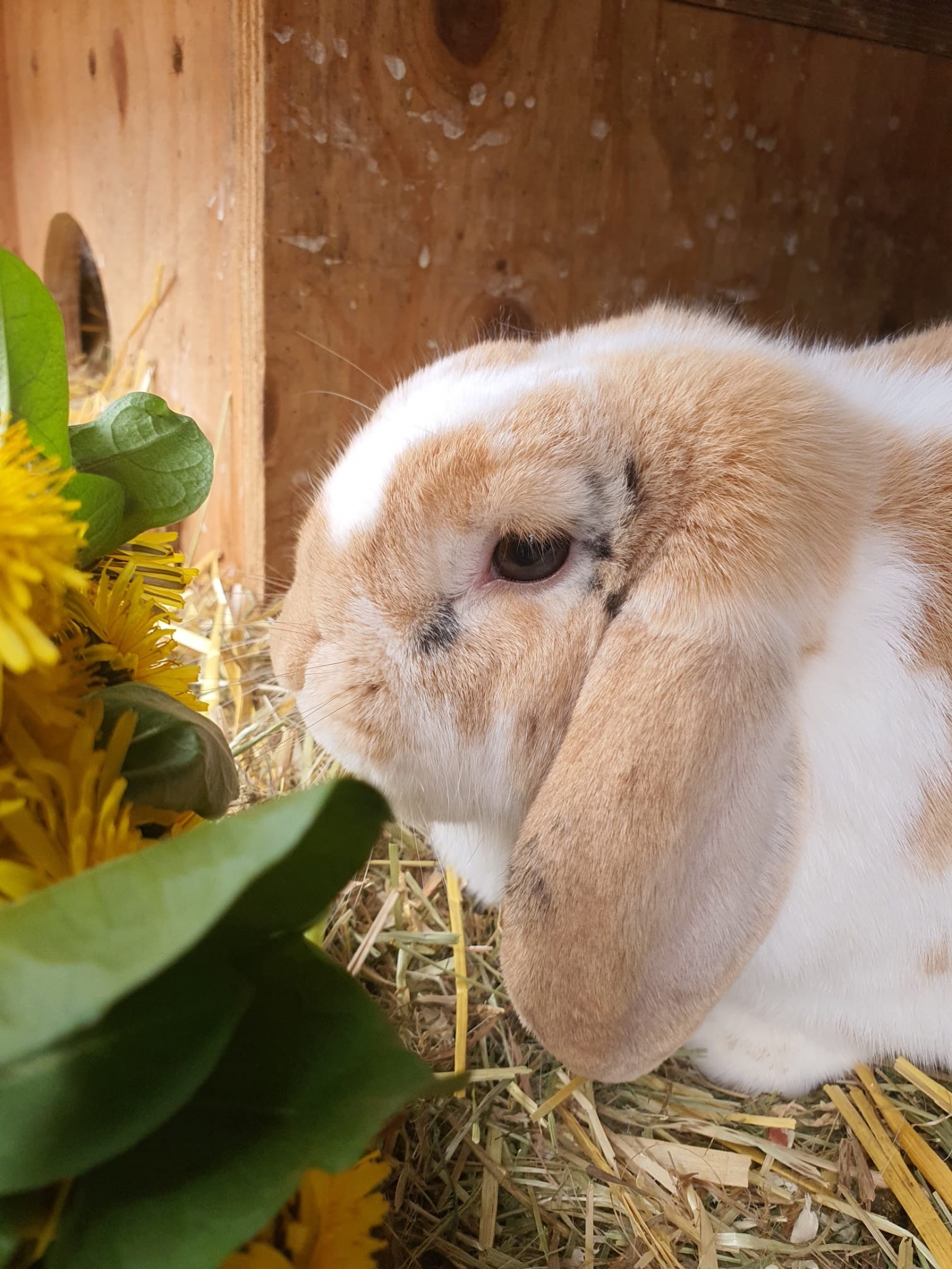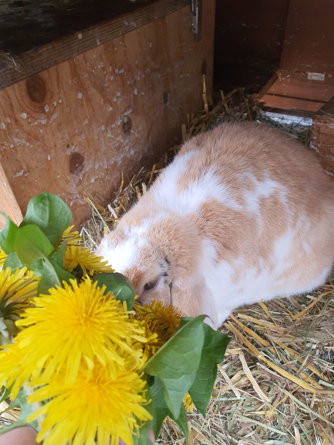 Kuschel ist 6 Jahre alt und kastriert. Er hat hellbraunes Fell mit weißen Flecken. Er ist zahm, frisst aus der Hand, lässt sich aber schlecht einfangen.